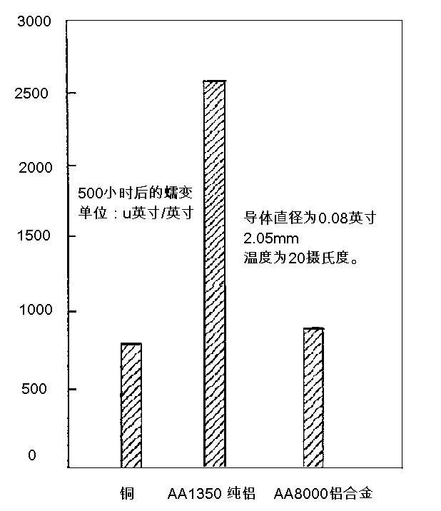 4、抗蠕變性能:銅、純鋁、鋁合金導體,在通過500小時的蠕變試驗中,可以看到,和純鋁導體相比,鋁合金導體的抗蠕變性能約是純鋁的280%,和銅導體基本一致。